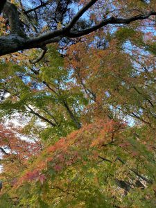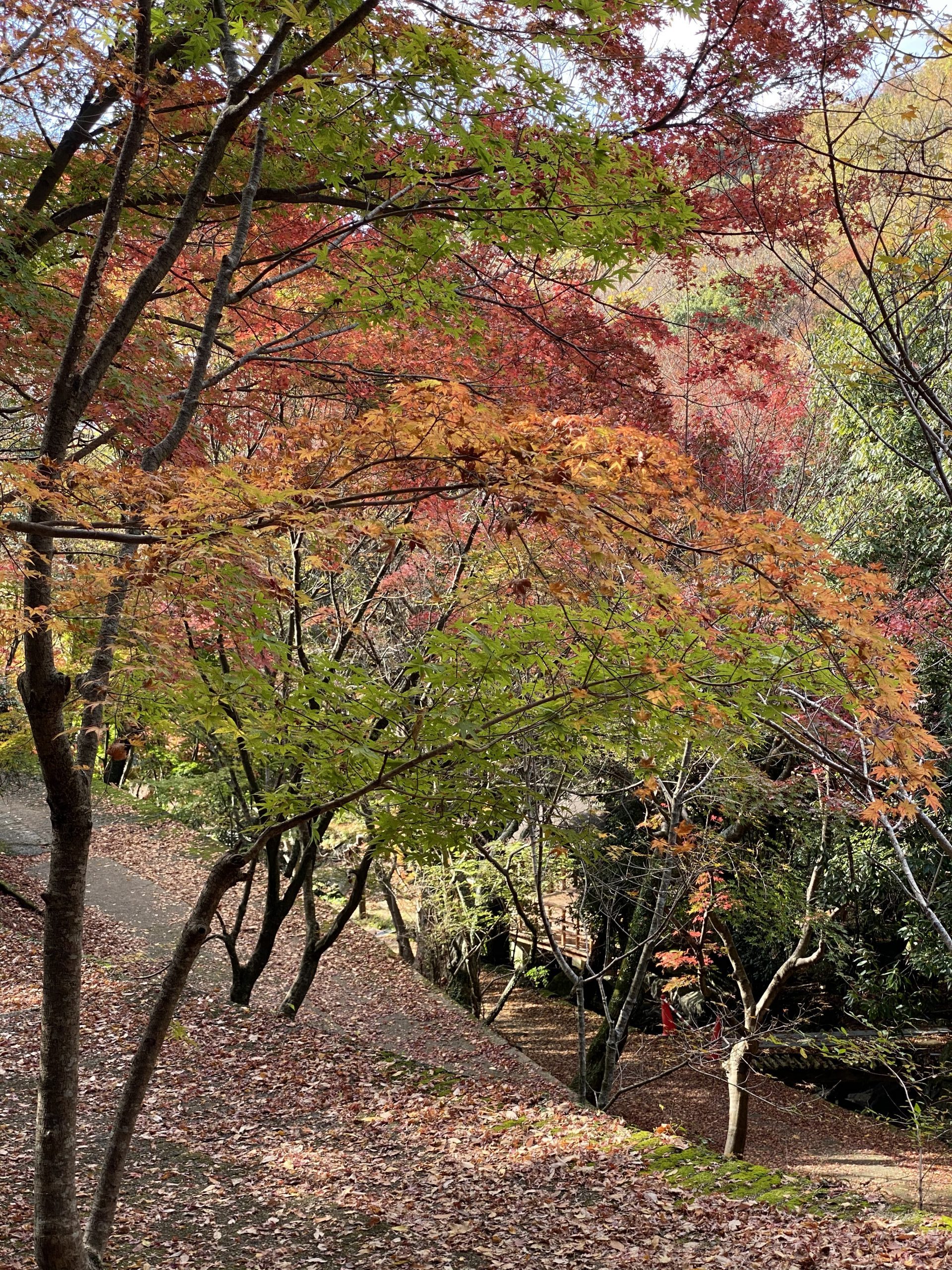ピンクの落ち葉がジュータンのように一面に敷き詰められています。紅葉も最後です。