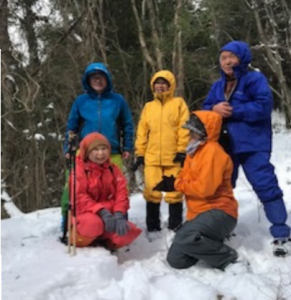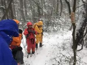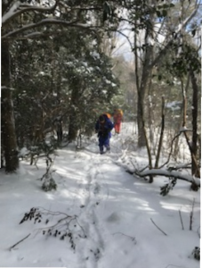 今回は雪山を楽しむことに主眼を置いた山行に変更し下山後に温泉でゆっくりするため、次回の縦走取付きを考慮して直下にある林道までが一番近い北上畑山から樹林帯の急斜面を下ることになりました。藪も雪に埋もれて気持ち良く下れてすぐに林道にでましたが、次回の藪こぎが頭をよぎりました。林道にはしっかり新雪が積っているため、いつもならだらだら長く続く下り道も、サクサクと踏みしめて楽しく歩くことが出来ました。今回の山行は参加者から冬山を満喫できたと好評でした。(記:阿部)