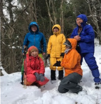 国道318号線の鵜の田尾トンネルの香川県側に車を置いて、積雪を踏みしめながら鵜(うのたお)峠まで荒れ果てた旧国道を歩き、鵜峠からはストックとアイゼンを着けての縦走となりました。途中の急斜面ではザイルで斜張りしながら通過したため時間を浪費し、北上畑山で昼食をとりました。