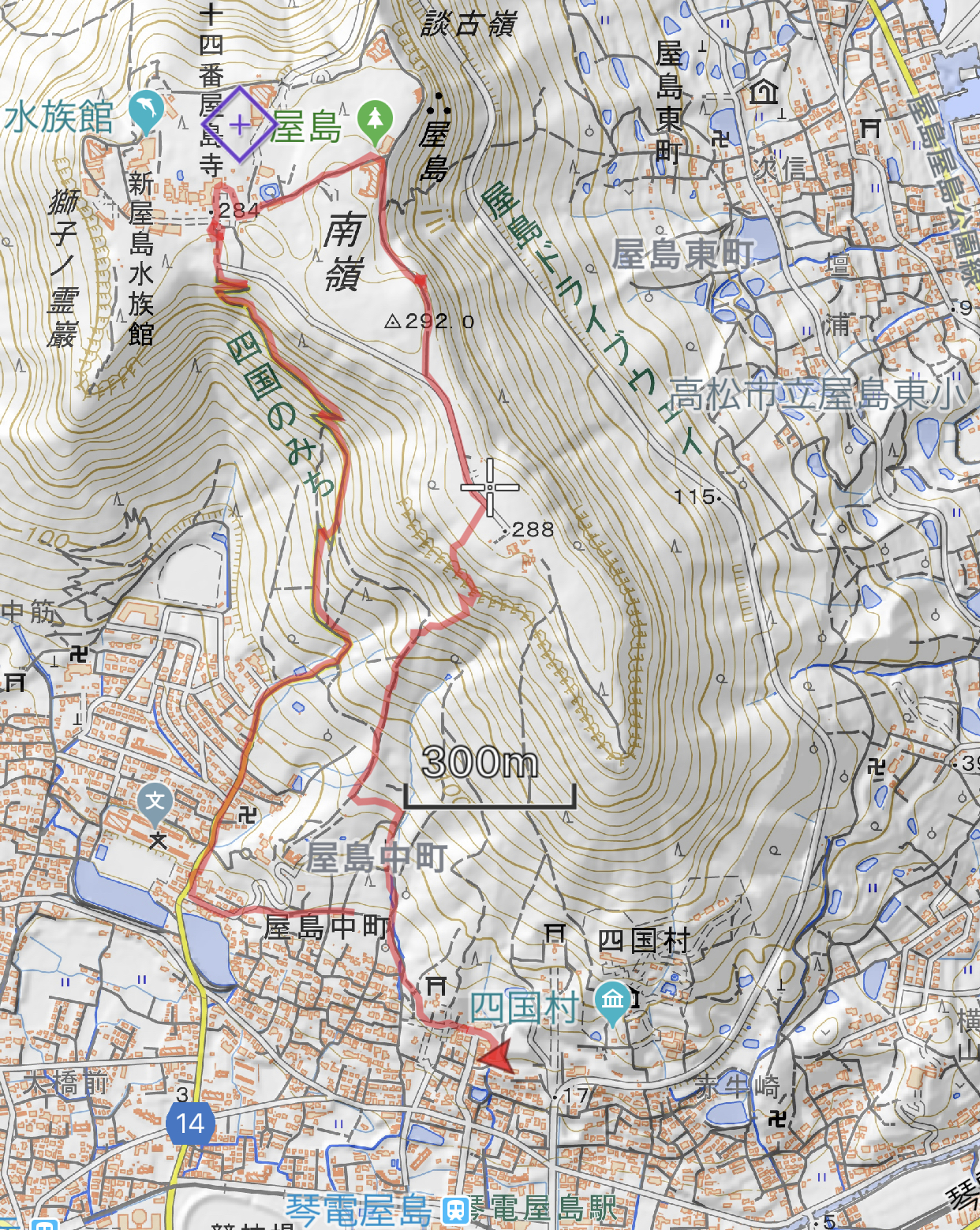 帰りは、旧屋島ケーブル手前から岩場を避けて一気に急坂を下りました。