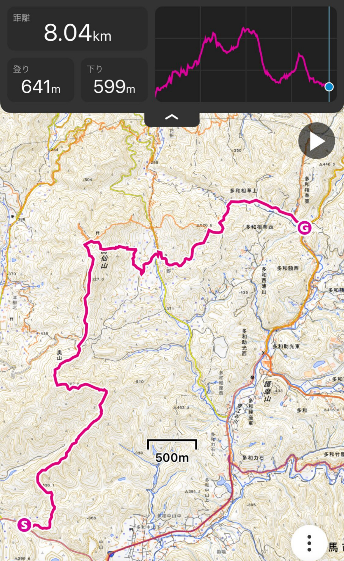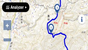 讃岐山脈は香川県に入ってから女体山・矢筈山を経由して西に進み高仙山で90度南へ曲がって県境まで5km程を戻ります。