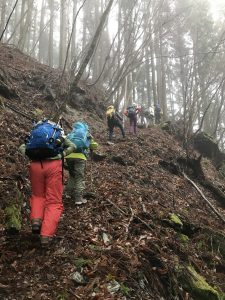 雨上がりのぬかるむ登山道に行く手を阻まれながら頂上を目指しました。