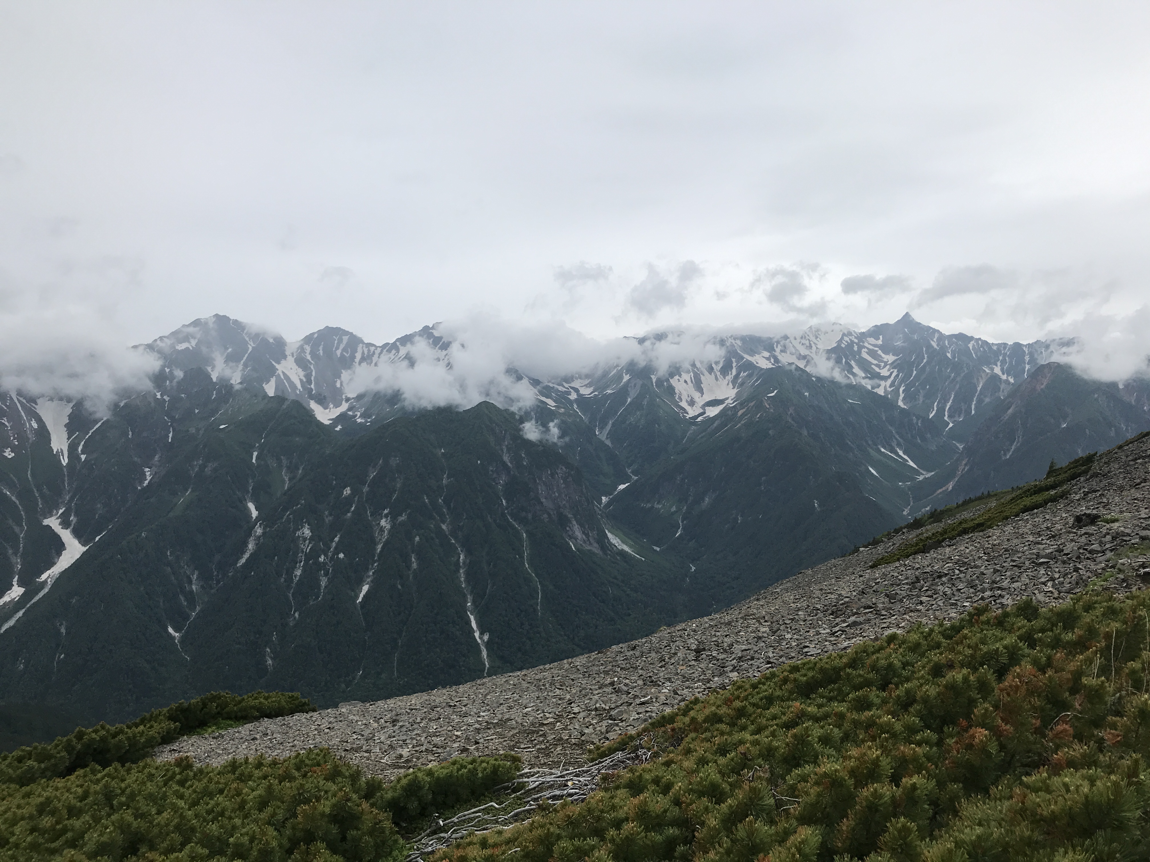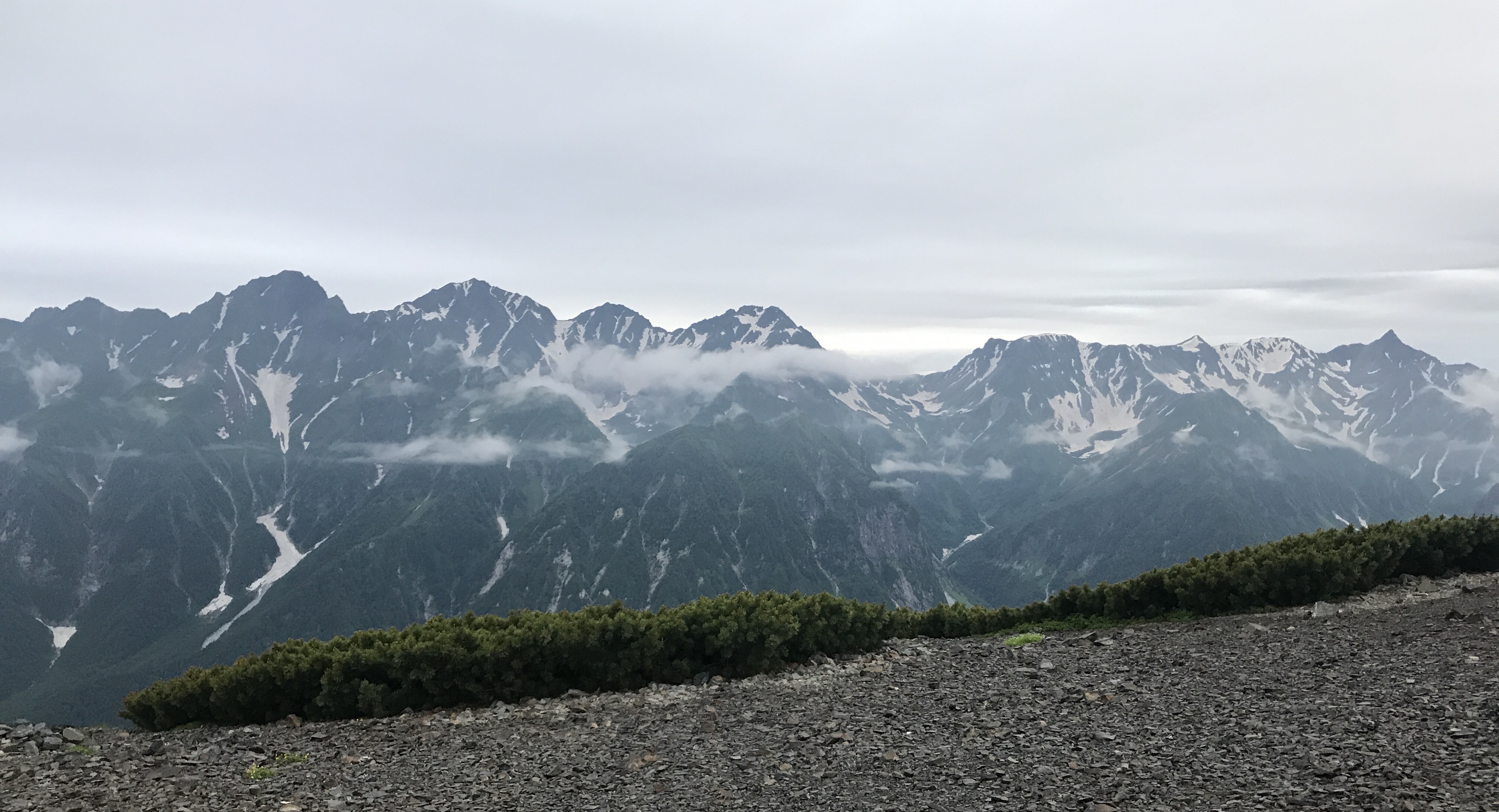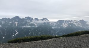 梅雨が明けていなので、雨を覚悟していましたが、蝶ヶ岳から穂高岳、槍ヶ岳の雄大な景色を見ることが出来ました。