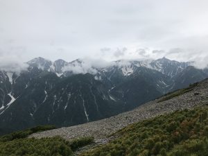 妖精ノ池辺りが樹林限界で少し登ると谷の向かいに穂高岳から槍ヶ岳の雄大な景色が目の前に広がります。頂上付近にガスがかかって少し残念でしたが、ようやく気が晴れました。