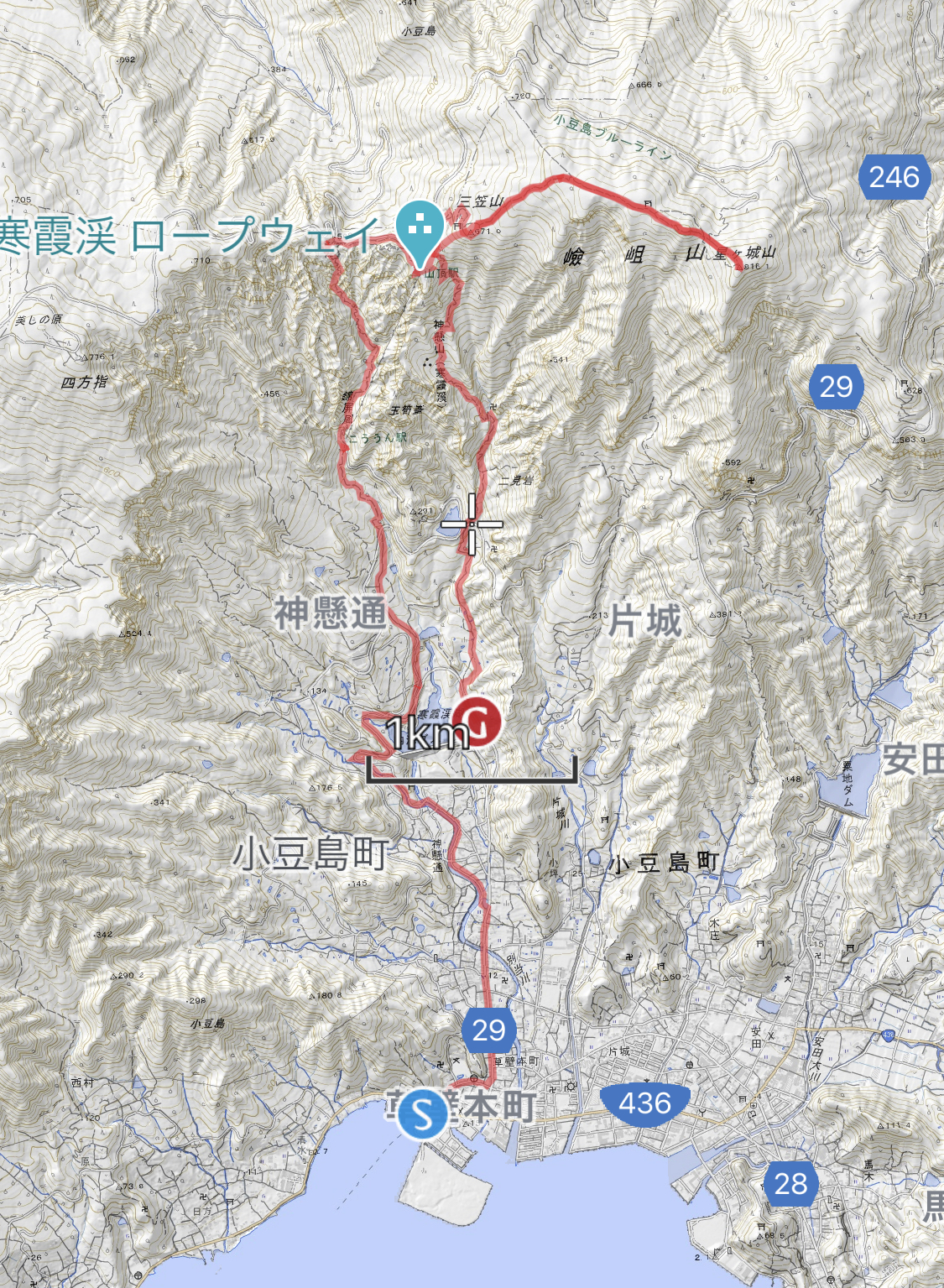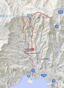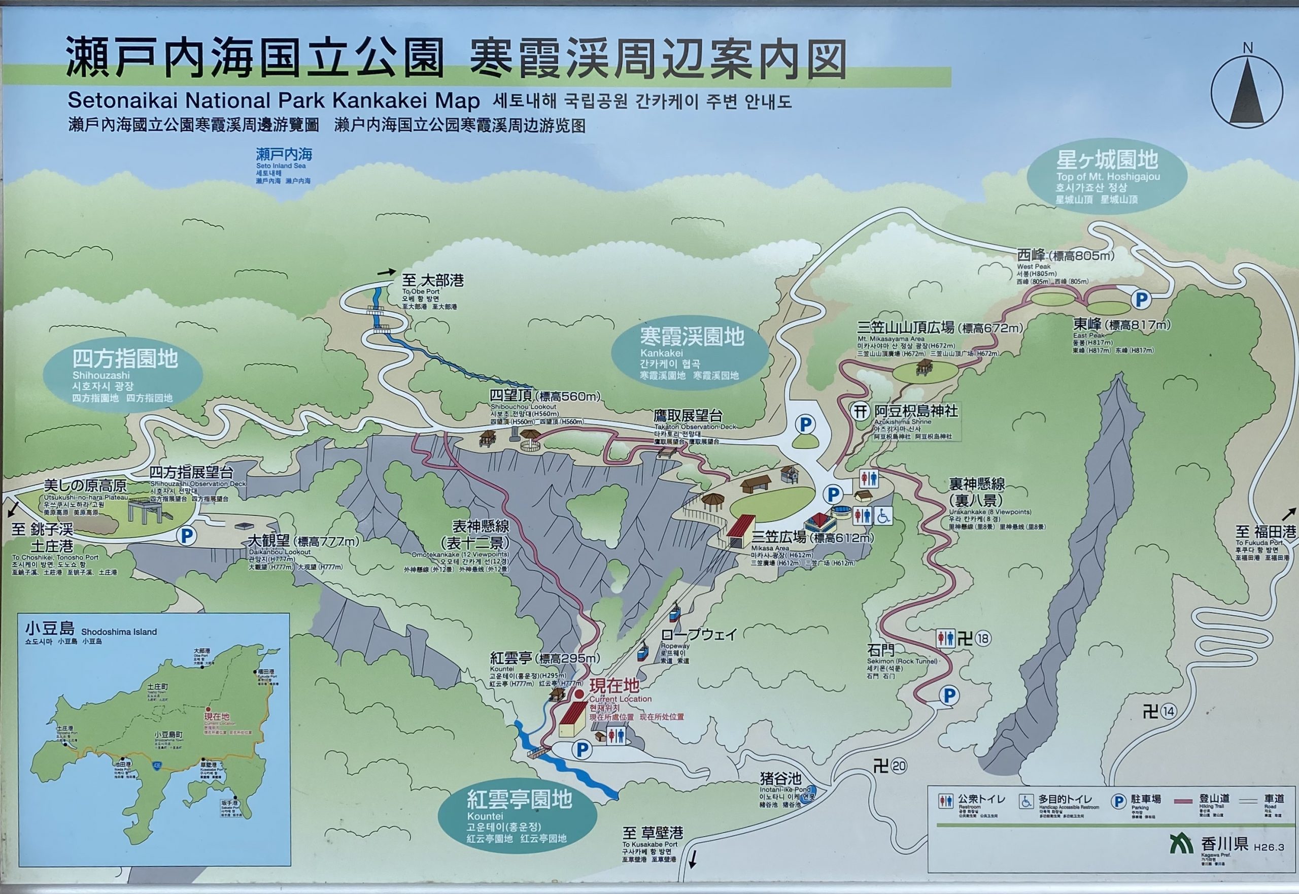 草壁港までフェリーで行って海岸線(0m)から名勝・寒霞渓を周り星ケ城山(816.7m)まで登る計画を検討しましたが、草壁行では時間が合わず土庄港へ高速艇で行き、バスで草壁港まで移動することになりました。
