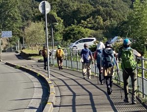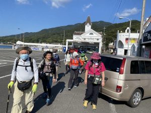 秋晴れの中、草壁港を9:05に出発、内海ダム畔のさくら広場まで車道を約1時間歩きます。