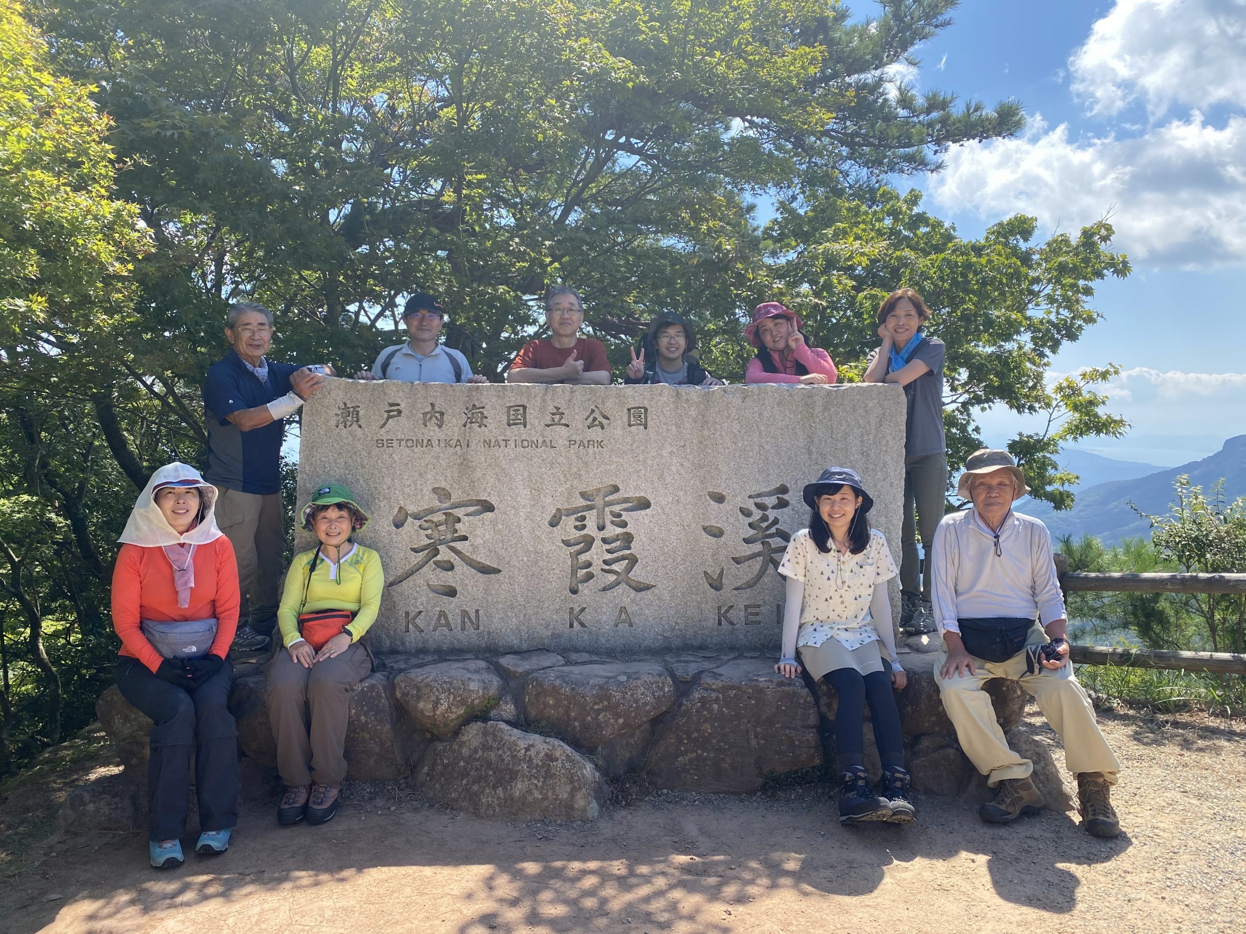 連休とgotoトラベルの影響で人が多いので、新型コロナ対策として三密に注意しながら昼食休憩、食後に瀬戸内海国立公園・寒霞渓の石碑で記念撮影をしました。