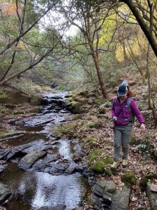 不動の滝に戻り、八十場登山口に戻るコースを、会員3名(男性1名、女性2名の)