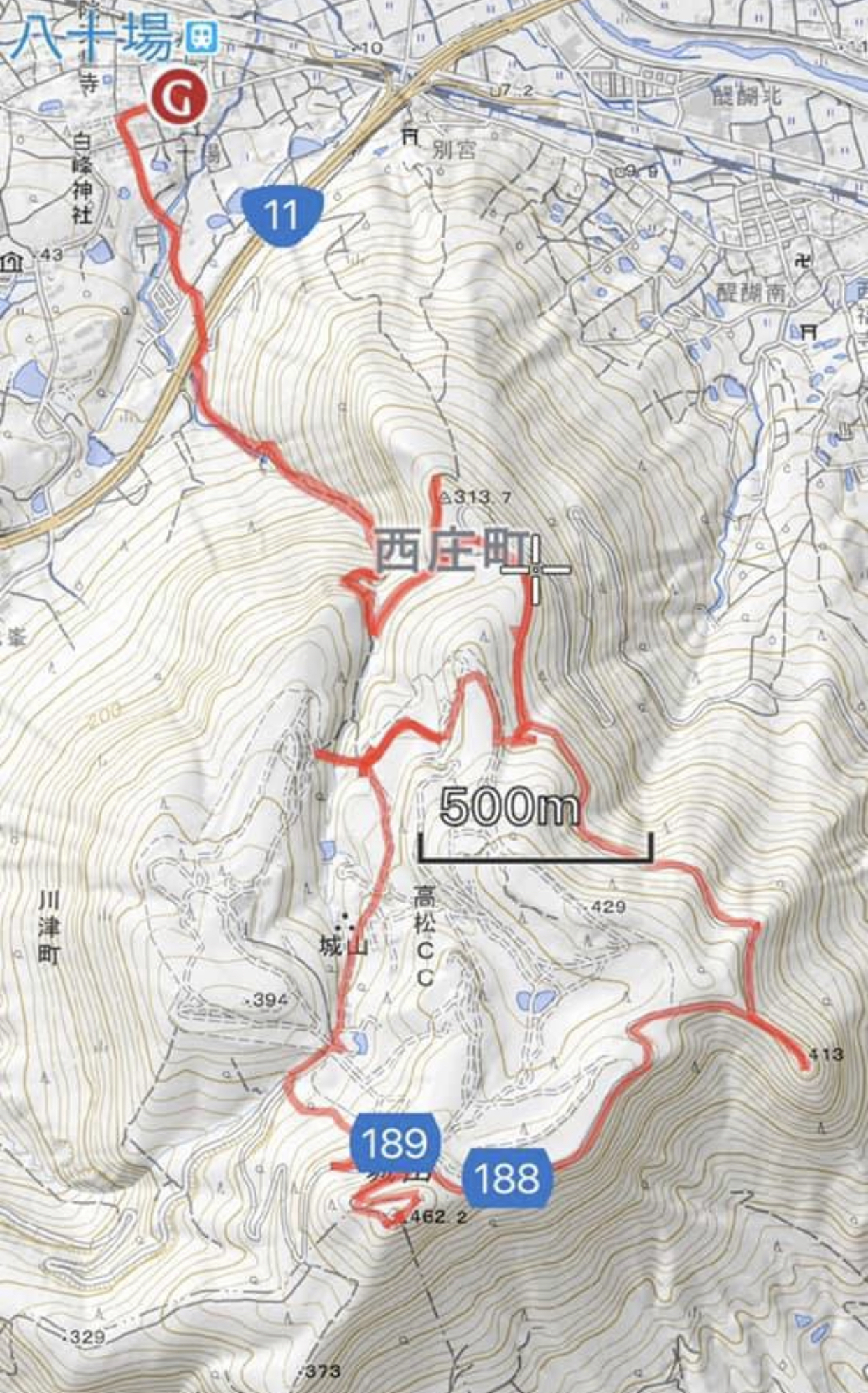 城山(462.3m)頂上を経て、八十場コース本来のゴルフ場を通るコースを通り