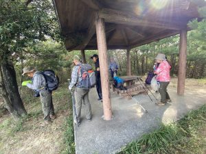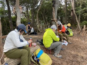 女性交流登山に参加の観音寺あけぼの山の会が先に着いてひろばで食事中でした。
