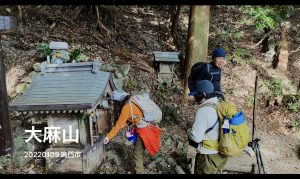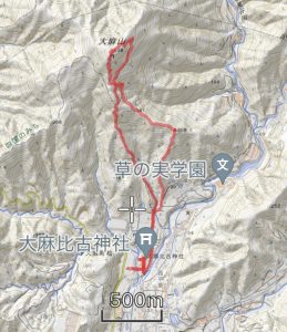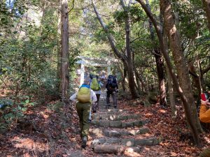 コース:9:00大麻比古神社〜9:20登山口〜10:00真名井の水分岐〜10:55大麻山(奥宮)11:00〜11:25真名井の水11:30〜11:50展望台(三角点)12:15〜12:47登山口〜13:00大麻比古神社
